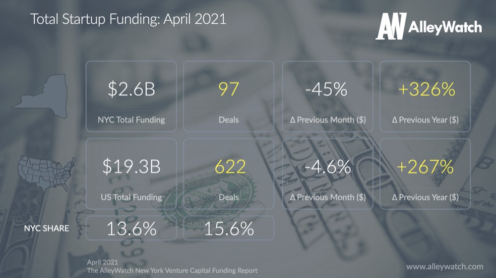 After setting a record for single-month startup funding in March, April funding came in strong with $2.6B raised by NYC startups across 97 deals, the single highest monthly total number of companies funded.