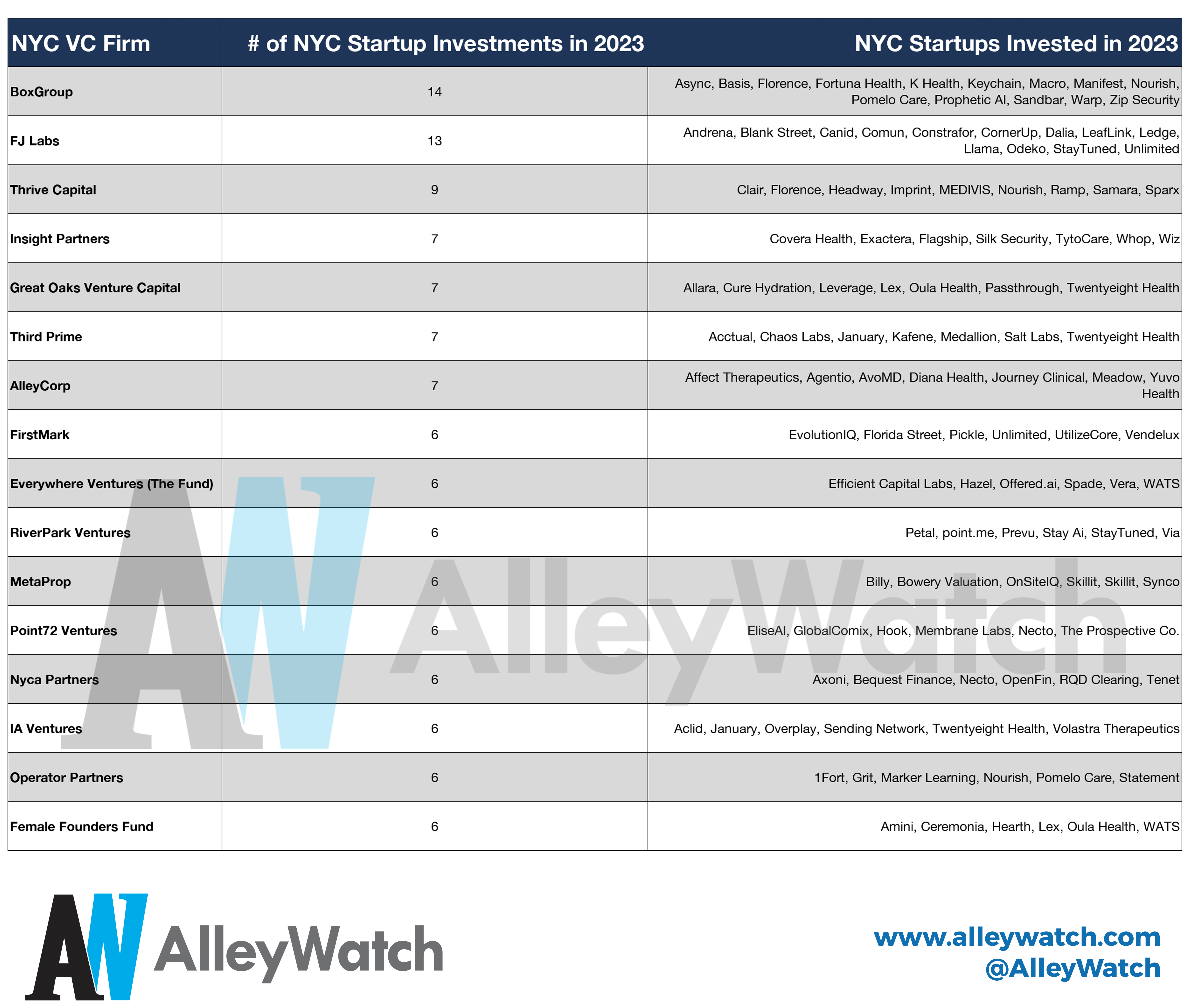 Today, I took the time to scour through some data to isolate the most active New York City venture capital firms that are investing in the greatest number of NYC startups (this analysis is not based on dollar amounts) across all stages of the venture cycle. As you seek out your next round, hopefully, this will serve as a handy resource to know where the dollars are pouring in from in the NYC tech ecosystem. Included for each firm is the number of investments made in NYC startups in 2023 and the NYC startups that the venture firms invested in during the year.