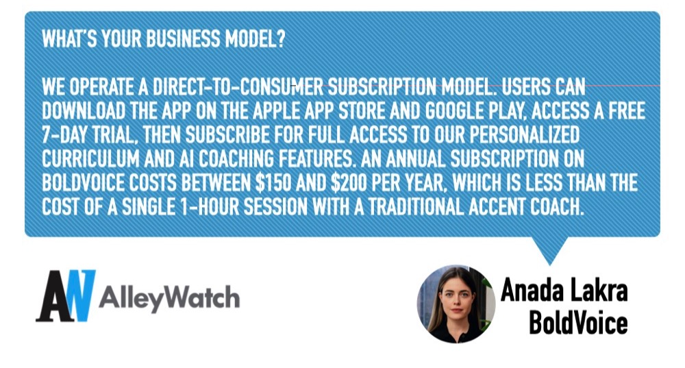 We operate a direct-to-consumer subscription model. Users can download the app on the Apple App Store and Google Play, access a free 7-day trial, then subscribe for full access to our personalized curriculum and AI coaching features. An annual subscription on BoldVoice costs between $150 and $200 per year, which is less than the cost of a single 1-hour session with a traditional accent coach.