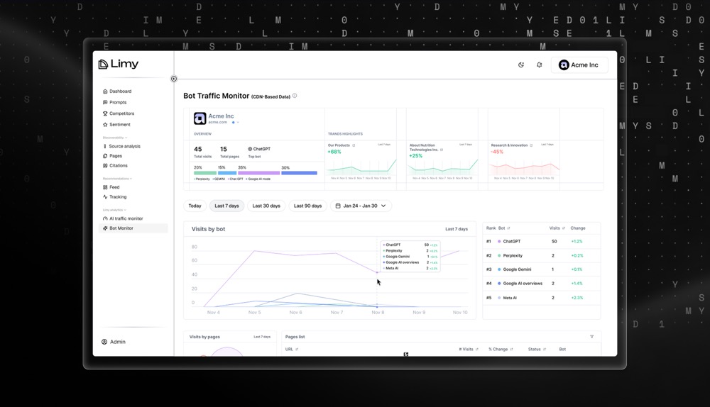 Other players in this space are focused on what users are entering into LLMs, i.e. user data but in the Agentic Web, agents’ actions are much more important and that’s where Limy operates, giving us a clear advantage. Our technology is uniquely positioned at the intersection of a brand’s web domain and the internet, where data and traffic converge. The platform identifies and decodes every agent and bot interaction that takes place within a site, detecting what information is being fetched and what action is or isn’t being taken. This creates a direct, measurable link between prompts, agent behavior, and business impact. Limy produces its own proprietary data based on these agent interactions, generating specific insights for brands to win AI visibility as the LLM answer. Moreover, by operating directly at the infrastructure web layer, Limy has developed an attribution model based on its distinct ability to track and value the entire customer journey via AI and assign prompts to revenue. Limy is the first platform to connect AI agents to real user outcomes, revealing why, how and what value was generated from AI traffic.